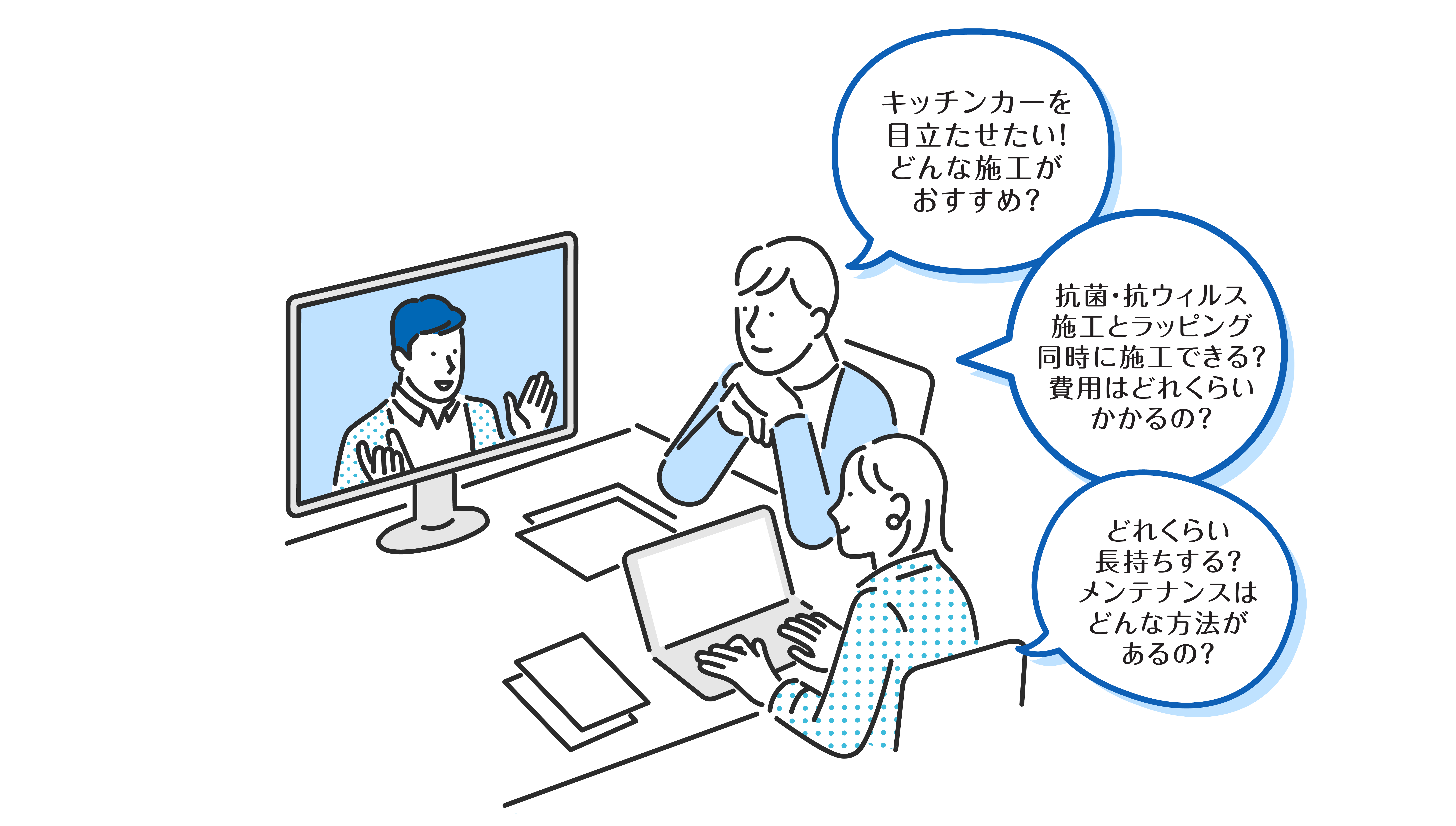 オンライン相談では資料や画像の共有、実際に施工を希望するお車や事務所などをスマホやタブレット、パソコンのカメラで写していただきながらご相談いただけます。また、資料がございましたら事前にメールでお送りいただけるとスムーズです。施工について、正式なお見積もりは現地へお伺い致しますが、お見積もりの前に確認したいこと、気になることはどんなことでもご相談ください。